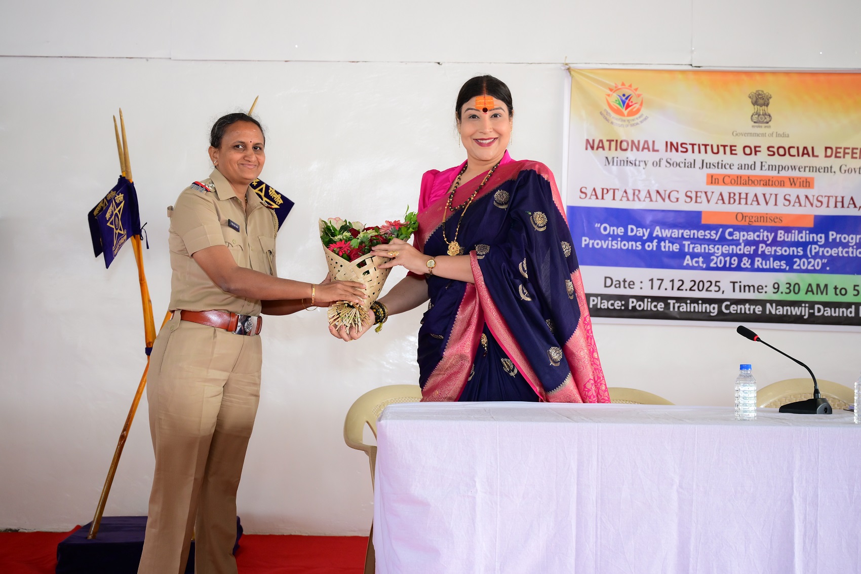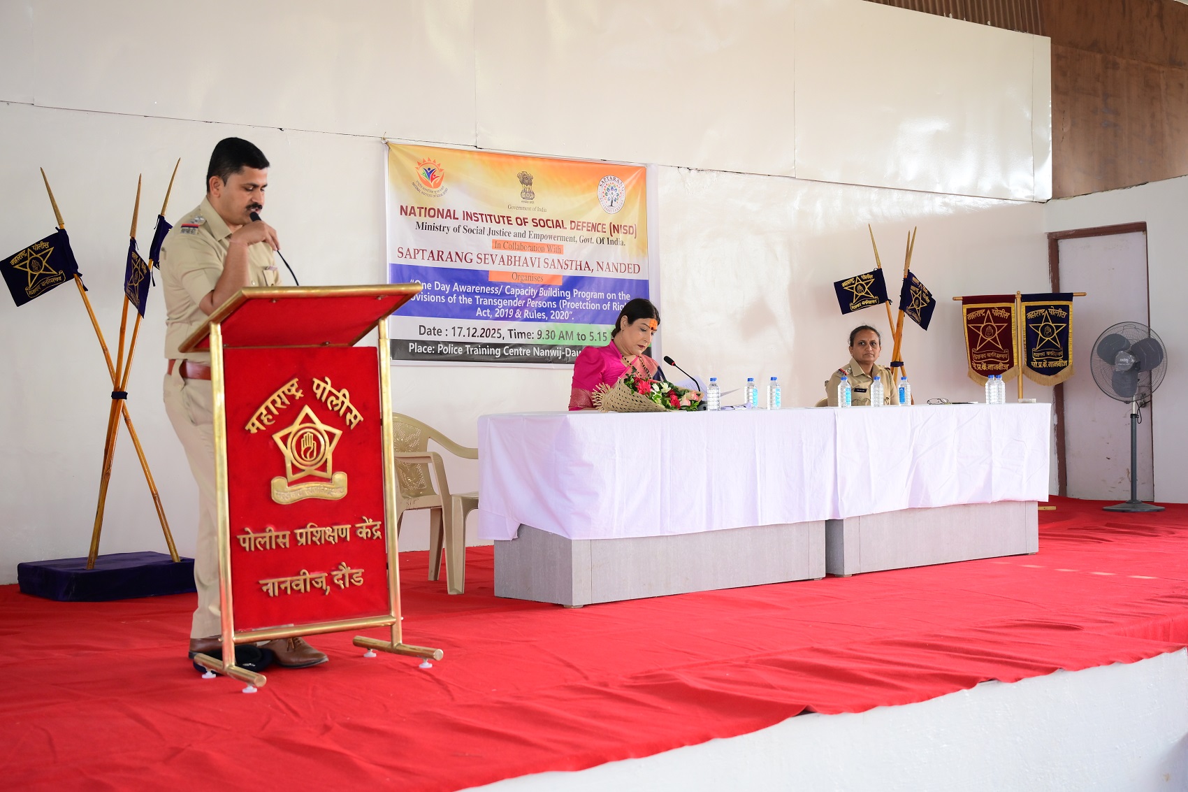 पोलीस प्रशिक्षण केंद्र नानवीज दौंड येथे डॉ. सान्वी जेठवानी One day awareness capacity building program on the provision of the transgender person ( protection of rights ) या विषयावर मार्गदर्शन करण्यात आले.तसेच माननीय श्री. नंदकुमार ठाकूर, भा.पो.से.प्राचार्य पोलीस प्रशिक्षण केंद्र, नानवीज दौंड, यांचे मार्गदर्शनाने , श्री.रघुनाथ शिंदे, उपप्राचार्य पोलीस प्रशिक्षण केंद्र, नानवीज दौंड सर्व अंतर वर्ग, बाह्य वर्ग पोलीस अधिकारी, प्रशिक्षक ,तसेच सत्र क्रमांक ४७ मधील नवप्रविष्ठ पोलीस प्रशिक्षणार्थी उपस्थित होते.